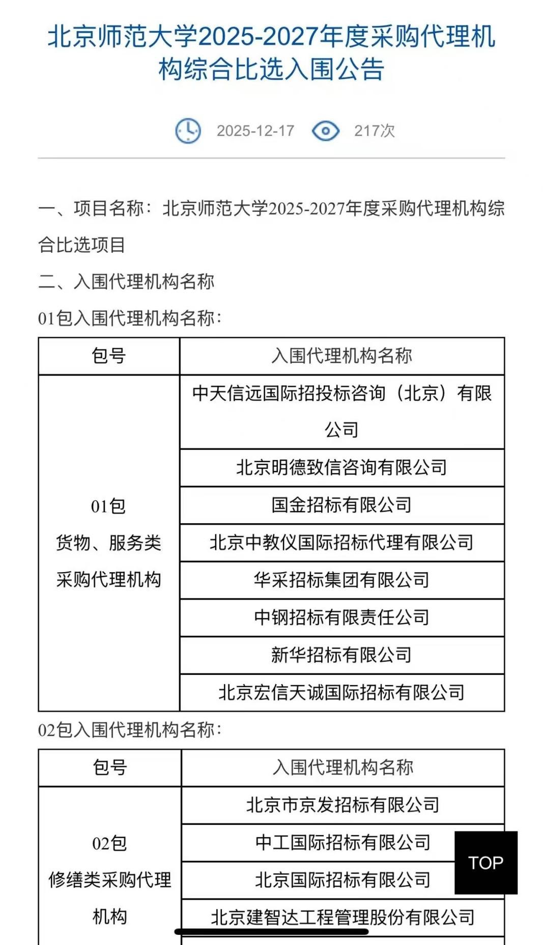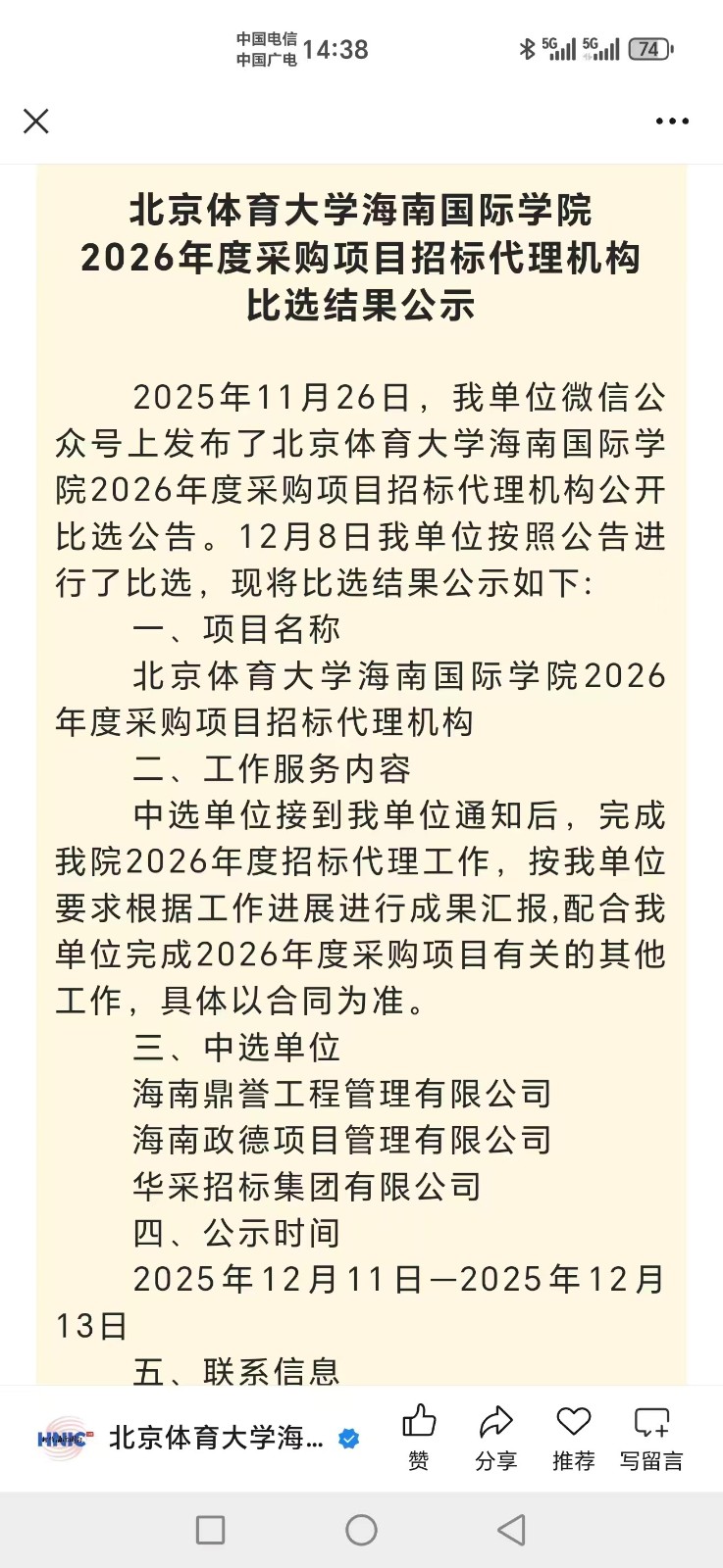 近日,華采招標(biāo)集團(tuán)有限公司憑借專業(yè)實(shí)力與規(guī)范服務(wù),先后成功入圍北京師范大學(xué)、中央戲劇學(xué)院、北京體育大學(xué)海南國(guó)際學(xué)院、瓊臺(tái)師范學(xué)院等四家高校,以及北京市西城區(qū)展覽路街道、海南省第三人民醫(yī)院、海南省老年病醫(yī)院三家政企醫(yī)療單位的招標(biāo)代理機(jī)構(gòu)庫(kù),實(shí)現(xiàn)多領(lǐng)域業(yè)務(wù)拓展新突破。