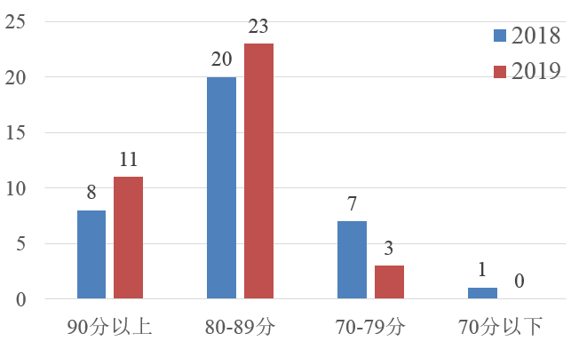 (一)政府采購信息公開整體水平明顯提升。各地區(qū)高度重視政府采購信息發(fā)布平臺建設,普遍加強了對采購項目信息發(fā)布的監(jiān)管力度,其中,北京、福建、廣東、天津等地區(qū)政府采購信息公開工作一直穩(wěn)定在較高水平。從得分分布看(圖1),高分段地區(qū)增多、低分段地區(qū)減少,90分以上地區(qū)由2018年的8個增加到2019年的11個,80分以下地區(qū)由2018年的8個減少到2019年的3個,首次實現(xiàn)沒有低于70分的地區(qū)。